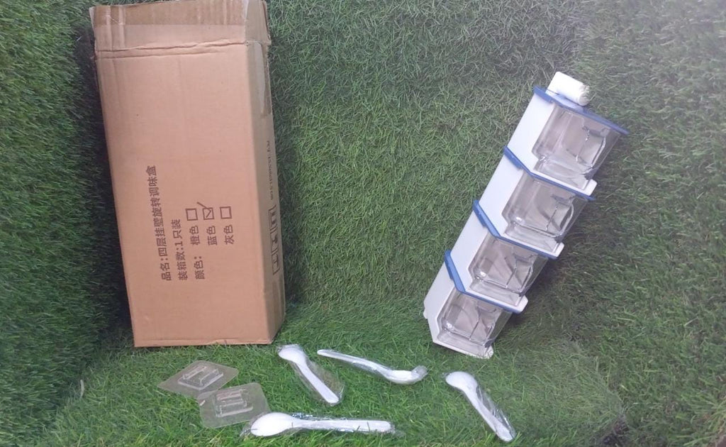 5942 4 Layer Creative Adhesive Wall Hanging Rotary Seasoning Box Condiment Storage Container Kitchen with Spoon Pepper Sugar Spice Jar Rack Food